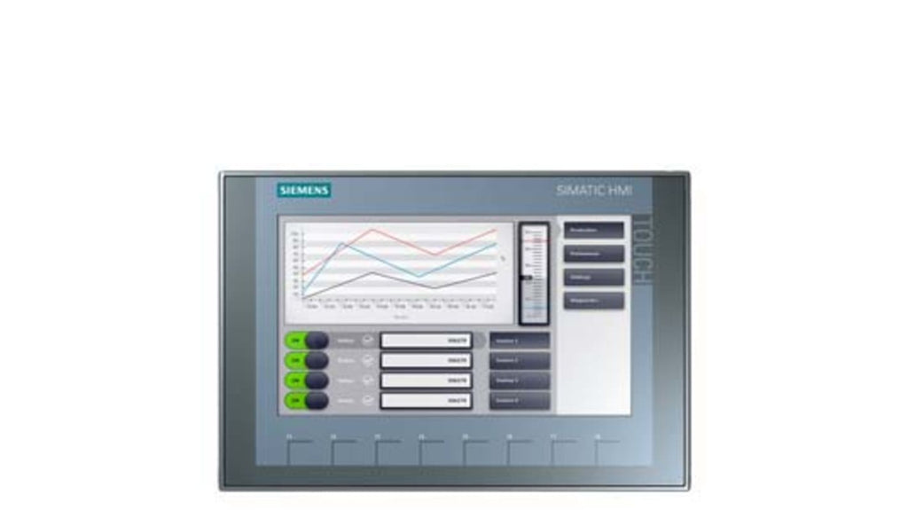 Pannello HMI touchscreen Siemens, 12 poll., serie SIMATIC, modello KTP1200 Basic, tensione di alimentazione 24 V c.c., display TFT a colori con risoluzione 1280 x 800 pixels, retroilluminazione regolabile, grado di protezione IP65, dimensioni 330 x 245 x 60 mm, temperatura operativa da 0 a 50 gradi Celsius, interfaccia PROFIBUS, 3 porte (RS-422, RS-485, USB), memoria onboard 10 MB, 256 kB.
