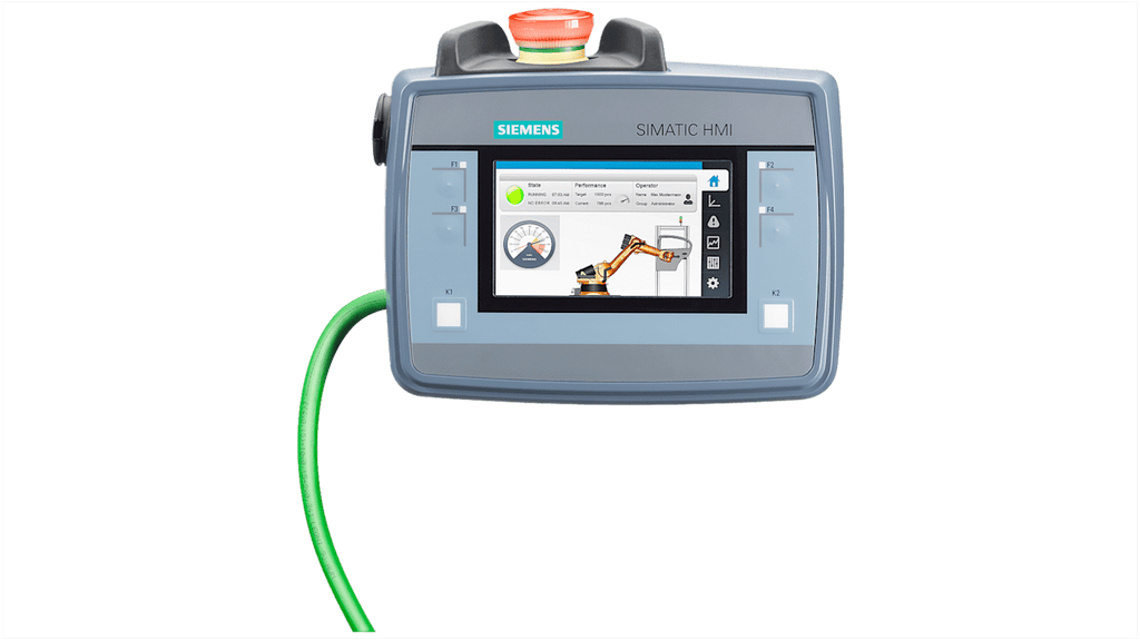 Pannello HMI Siemens, KTP400F Mobile, display TFT widescreen da 4,3 pollici, risoluzione 480 x 272 pixels, interfaccia PROFINET, configurabile tramite WinCC Comfort V13 SP1 con HSP, rapporto di aspetto 16:9, 16 milioni di colori, area display ingrandita del 40%, regolabile al 100% per adattamento ambientale.