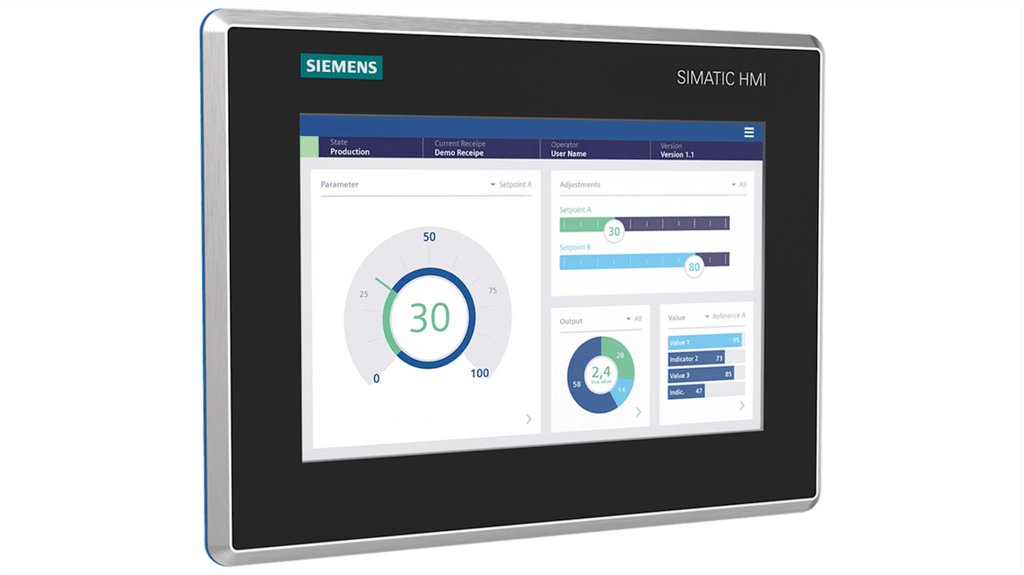 Pannello HMI Siemens MTP700 Comfort unificato, display TFT widescreen da 7 pollici, 16 milioni di colori, design igienico in acciaio inossidabile, grado di protezione IP69, guarnizione blu conforme alla FDA, interfaccia PROFINET, configurabile con WinCC Unified Comfort V17, maggiore protezione dagli urti, protezione antischegge secondo DIN EN 1672-2 e FDA 21 CFR 177.2006. Codice costruttore 6AV2128-3GB40-0AX0.