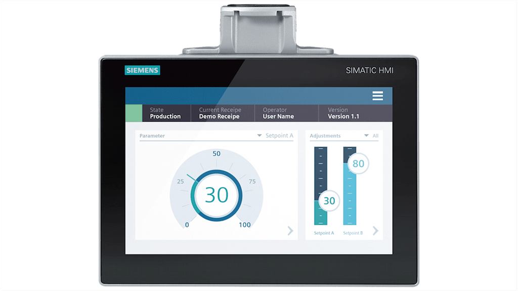 Pannello HMI Siemens, Comfort unificato MTP1200, display TFT widescreen da 12,1 pollici, risoluzione 1280 x 800 pixel, 16 milioni di colori, interfaccia PROFINET, configurabile con WinCC Unified Comfort V18, software open-source incluso. Codice produttore 6AV2128-3MB27-0AX0, non espandibile, montaggio su braccio di supporto con flangia in alto.