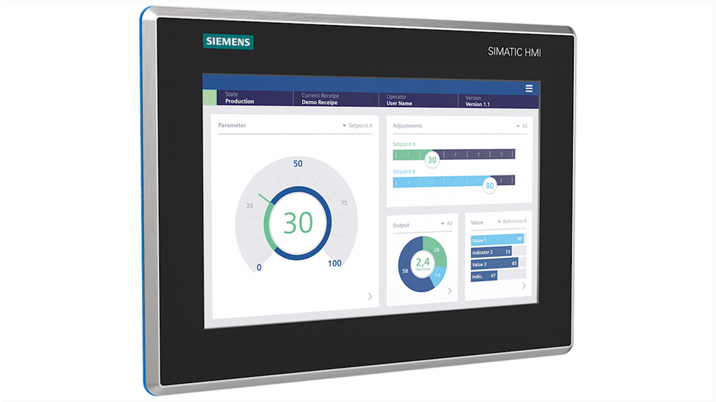 Pannello HMI Siemens, Comfort unificato MTP1200, display TFT widescreen da 12,1 pollici, risoluzione 1280 x 800 pixel, 16 milioni di colori, funzionamento touch, design igienico in acciaio inossidabile, grado di protezione IP69, guarnizione blu conforme FDA, protezione antischeggia secondo DIN EN 1672-2, interfaccia PROFINET, configurabile con WinCC Unified Comfort V17, software open-source incluso. Codice costruttore 6AV2128-3MB40-0AX0.