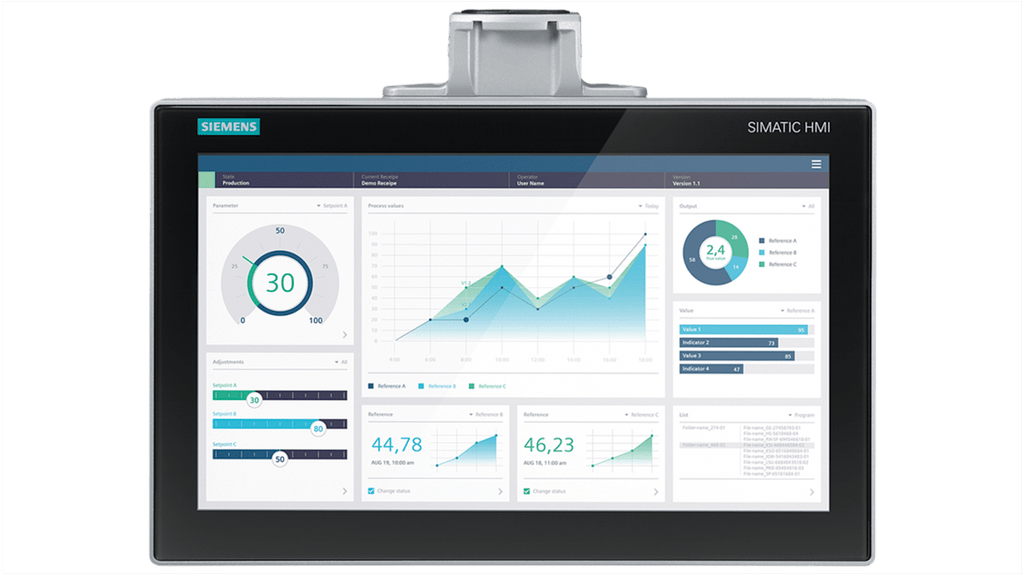Pannello HMI Siemens, SIMATIC, 15,6 pollici, display TFT widescreen, risoluzione 1366 x 768 pixel, interfaccia PROFINET, configurabile con WinCC Unified Comfort V18, software open-source fornito gratuitamente, non espandibile, montaggio su braccio di supporto con flangia in alto. Codice produttore 6AV2128-3QB27-0AX0.
