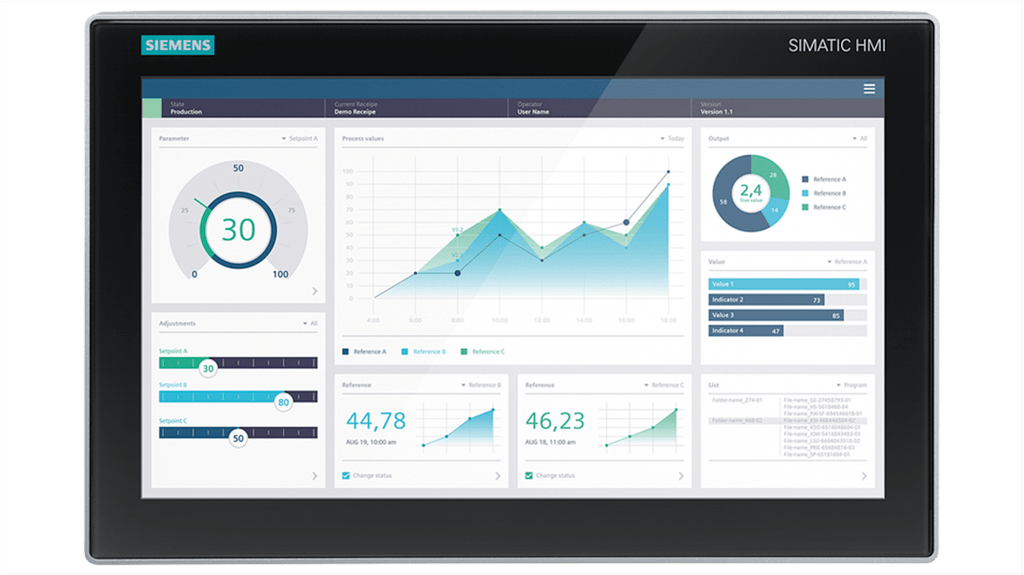 Pannello HMI Siemens, SIMATIC, 15,6 pollici, display TFT widescreen, risoluzione 1366 x 768 pixel, interfaccia PROFINET, configurabile con WinCC Unified Comfort V18, software open-source incluso, design per braccio di supporto espandibile, codice produttore 6AV2128-3QB27-0BX0.