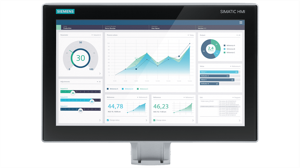 Pannello HMI Siemens, SIMATIC, 15,6 pollici, display TFT widescreen, risoluzione 1366 x 768 pixel, interfaccia PROFINET, configurabile con WinCC Unified Comfort V18, software open-source fornito gratuitamente, piede d'appoggio espandibile con flangia in basso, codice produttore 6AV2128-3QB27-1BX0.