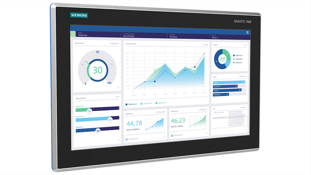 Pannello HMI Siemens, Comfort unificato MTP1900, display TFT widescreen da 18,5 pollici, risoluzione 1920 x 1080 pixel, 16 milioni di colori, funzionamento touch, design igienico in acciaio inox, grado di protezione IP69, guarnizione blu conforme FDA, protezione antischeggia secondo DIN EN 1672-2, interfaccia PROFINET, configurabile con WinCC Unified Comfort V16, software open-source incluso. Codice costruttore 6AV2128-3UB40-0AX0.