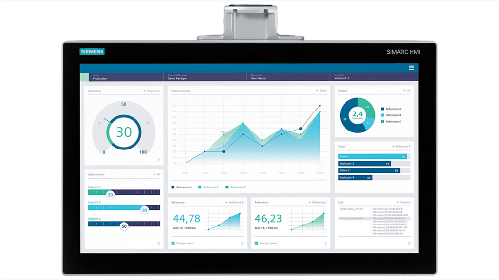 Pannello HMI Siemens, Comfort unificato MTP2200, display TFT widescreen da 21,5 pollici, risoluzione 1920 x 1080 pixel, 16 milioni di colori, interfaccia PROFINET, configurabile con Comfort V18, software open-source incluso. Codice costruttore 6AV2128-3XB27-0AX0, non espandibile, montaggio su braccio di supporto con flangia in alto.
