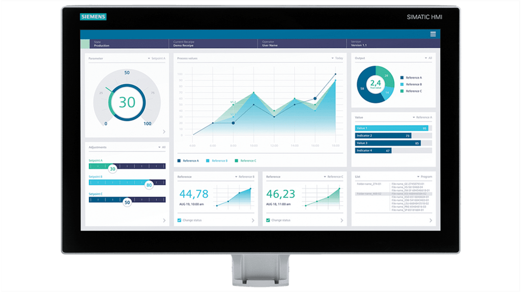 Pannello HMI Siemens, Comfort unificato MTP2200, display TFT widescreen da 21,5 pollici, risoluzione 1920 x 1080 pixel, 16 milioni di colori, interfaccia PROFINET, configurabile con Comfort V18, software open-source incluso. Codice costruttore 6AV2128-3XB27-1BX0, progettato per piede d'appoggio espandibile con flangia in basso.