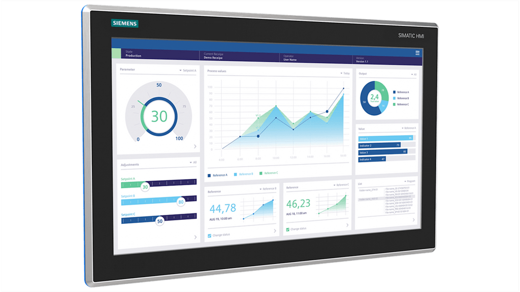 Pannello HMI Siemens, Comfort unificato MTP2200, display TFT widescreen da 21,5 pollici, risoluzione 1920 x 1080 pixel, 16 milioni di colori, funzionamento touch, design igienico in acciaio inox, grado di protezione IP69, guarnizione blu conforme FDA, protezione antischeggia secondo DIN EN 1672-2, interfaccia PROFINET, configurabile con WinCC Unified Comfort V17, software open-source incluso. Codice costruttore 6AV2128-3XB40-0AX0.
