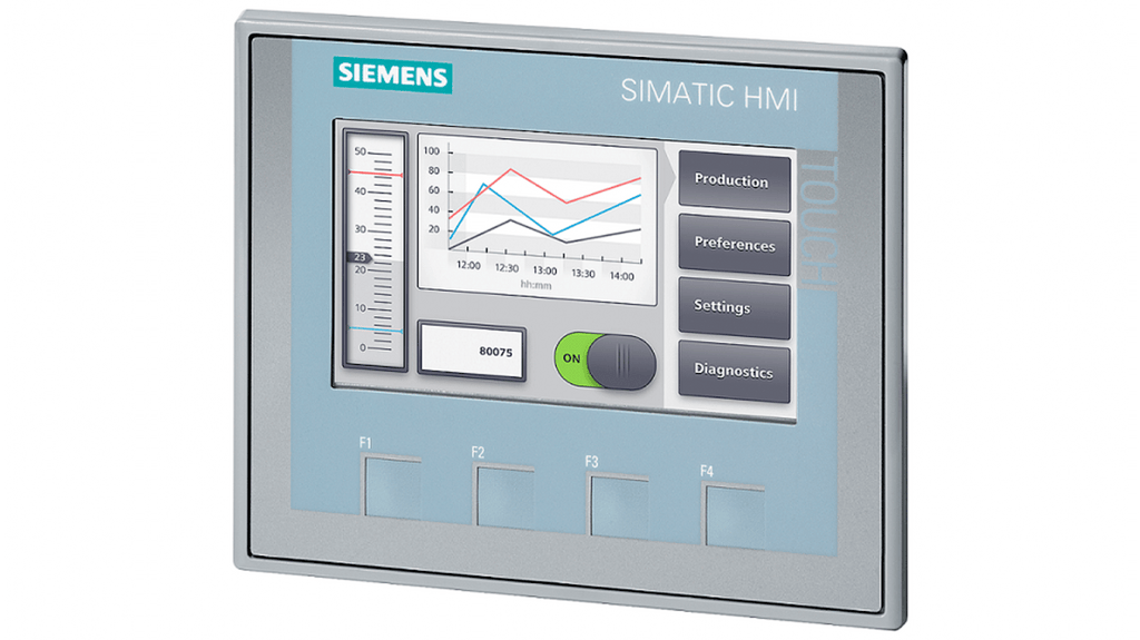 Pannello HMI Siemens, KTP400 Basic, 4.3 e, serie SIMATIC, display TFT. Risoluzione 480 x 272 pixels, 65536 colori, operazioni touch. Interfaccia PROFINET. Configurabile tramite WinCC Basic V13 e STEP 7 Basic V13. Include software open source.