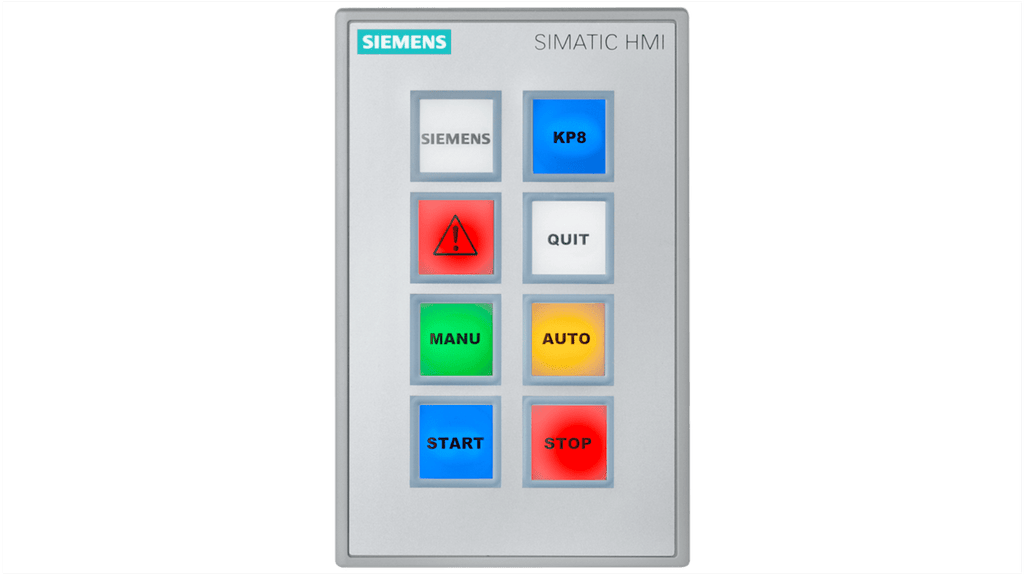 Pannello tasti HMI Siemens, KP8F, serie SIMATIC, con 8 interruttori a cortocircuito e LED multicolore, interfaccia PROFINET con PROFIsafe, grado di protezione anteriore IP65. Progettato per applicazioni industriali, garantisce robustezza e affidabilità.