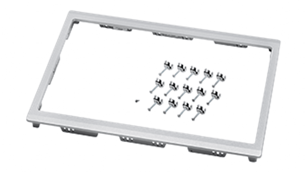 Staffa di montaggio per dispositivi tattili Widescreen da 19 pollici. Telaio adattatore progettato per integrare dispositivi tattili più piccoli nel ritaglio di installazione di dispositivi widescreen più grandi. Tipo accessori, cornice coperchio. Nessun obbligo di marcatura CE. Codice costruttore 6AV6881-6UD41-0AA0, marchio Siemens.