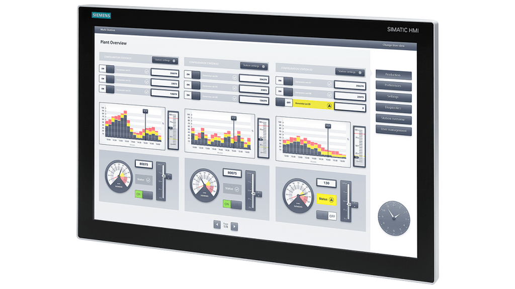 Display multi-touch Siemens SIMATIC IFP2400 V2 PRO, schermo piatto da 23,8 pollici, risoluzione 1920 x 1080 pixel, tecnologia TFT, retroilluminazione a LED, luminosità 250 cd/m², contrasto 1000:1, alimentazione 24 V CC, temperatura operativa 0-50 °C, grado di protezione IP65, dimensioni 527 mm x 296 mm, schermo in vetro minerale temperato e antiriflesso, interfaccia DisplayPort.