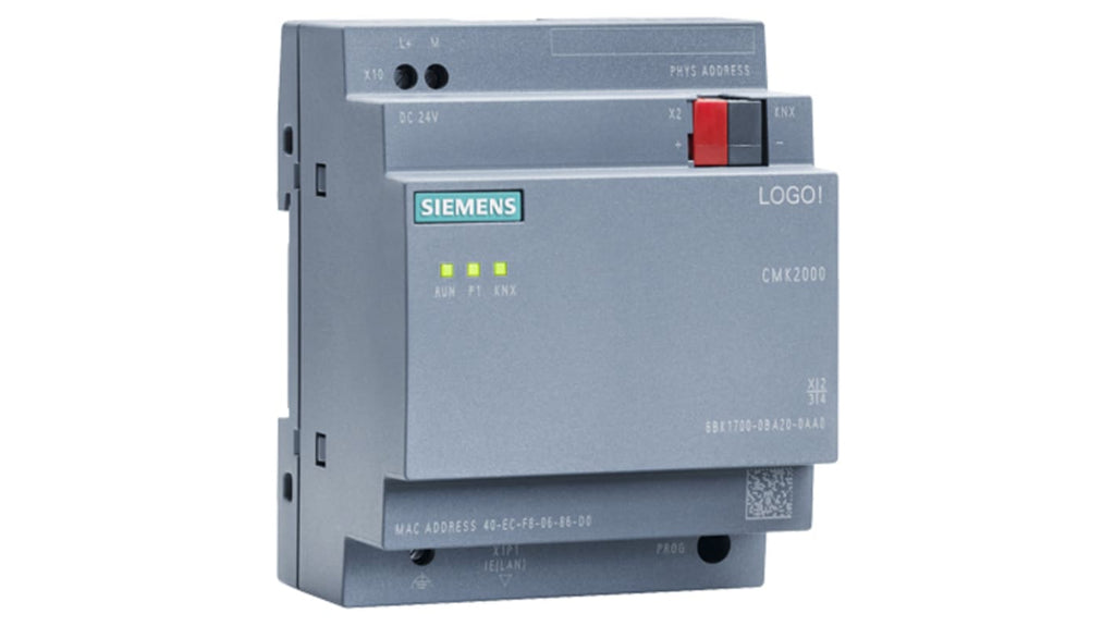 Modulo di comunicazione per LOGO! con 2 ingressi e 2 uscite digitali, tensione di alimentazione 24 V c.c., connessione Ethernet tramite porta RJ45, supporta 50 oggetti di comunicazione, montaggio su guida DIN, dimensioni 71,5 x 90 x 58,5 mm, temperatura operativa da 0 a 55 gradi Celsius, conforme a EN 55 011 e EN 61000-6-3. Codice costruttore 6BK1700-0BA20-0AA0.