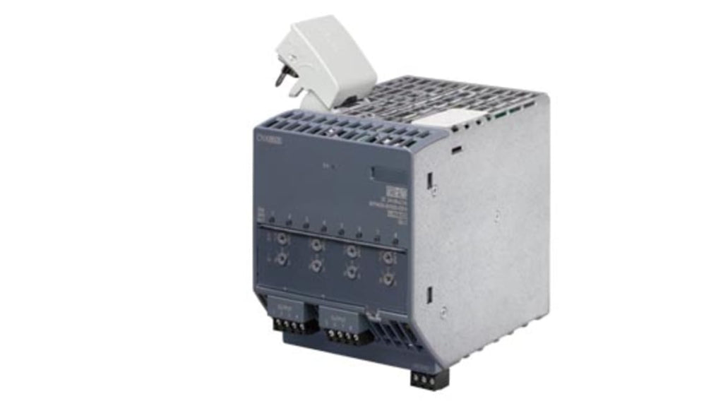 Modulo di ingresso/uscita Siemens SITOP CNX8600, tensione di alimentazione 60 V, 8 uscite da 2,5 A, configurazione tramite DIP switch per collegamento simultaneo o ritardo di 25 ms, 100 ms, design di protezione contro cortocircuiti, interruzione elettronica dei sovraccarichi, LED a 3 colori per stato di funzionamento, contatto relè con capacità di corrente 0,3 A, montaggio su guida DIN EN 60715. Compatibile con SITOP PSU8600.