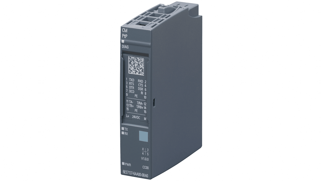 Modulo di comunicazione Siemens per Sistema I/O SIMATIC, serie 6ES713, dimensioni 15 x 73 x 58 mm, supporta connessioni seriali RS-422, RS-485 e RS-232, compatibile con BaseUnits BU tipo A0, ingegnerizzazione tramite STEP 7 TIA Portal, protocolli integrati MODBUS RTU, Freeport e 3964, operante in range di temperatura da -30 a 60 gradi Celsius, velocità di trasmissione massima 250 kbit/s, supporta dati I&M da I&M0 a I&M3.