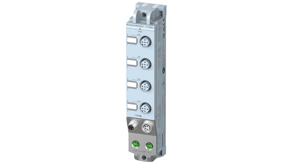 Modulo I/O PLC digitale, Siemens serie FX3G, codice 6ES7143-5AF00-0BA0, ingressi 4, uscite 8, tensione nominale 24 V c.c., corrente di uscita 4 A, grado di protezione IP67, dimensioni 159 x 30 x 40 mm. Compatibile con SIMATIC ET 200AL, progettato per applicazioni industriali.