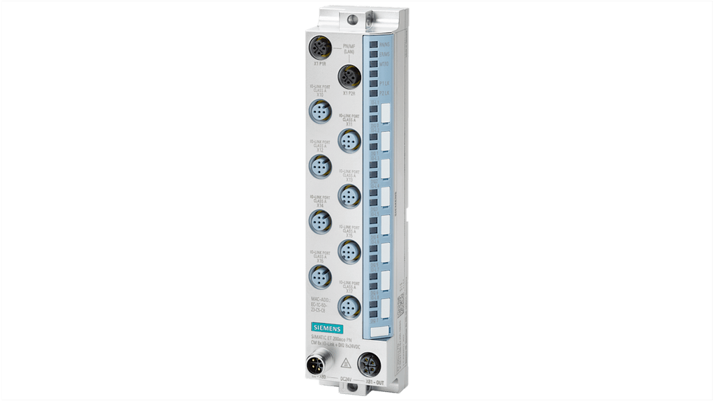 Modulo I/O per interruzione del filo all'ingresso, Siemens, serie 6ES7148. Dotato di 4 porte IO-Link e 12 canali di ingresso e uscita digitali, grado di protezione IP67/IP69K, progettato per applicazioni di automazione industriale. Compatibile con diversi dispositivi di campo, offre opzioni di controllo flessibili. Codice costruttore 6ES7148-6JE00-0BB0.