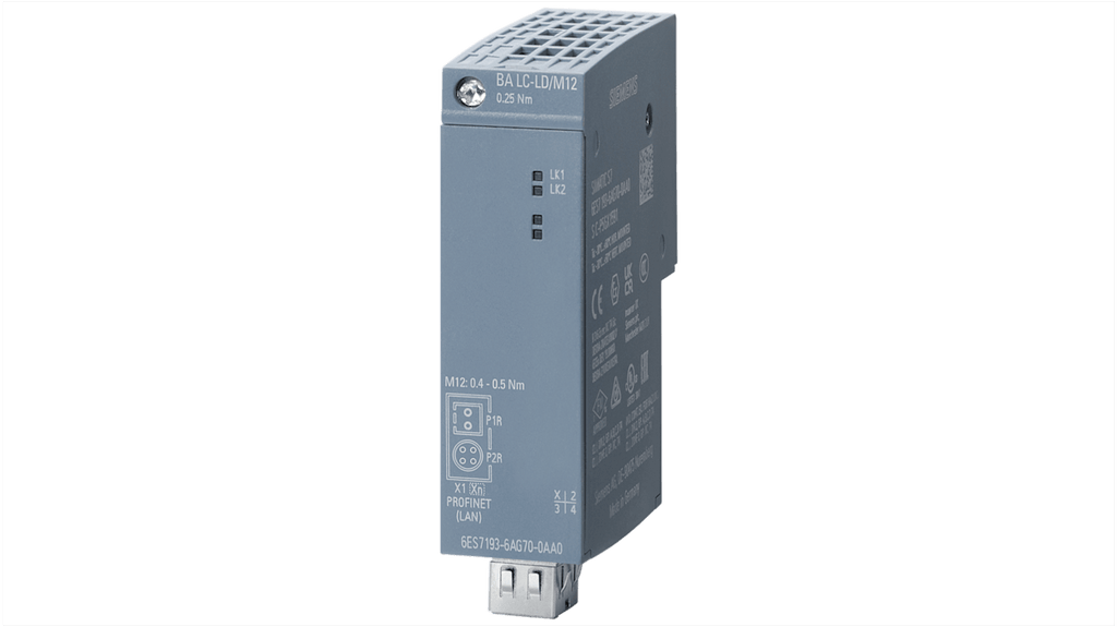 Modulo di comunicazione per automazione industriale, Adattatore Siemens serie 6ES7193, 1 porta LC-LD per cavi in fibra ottica monomodale, 1 presa M12 codificata D con meccanismo PushPull, altitudine di installazione massima 5000 m, compatibile con cavo in fibra ottica monomodale, progettato per migliorare la connettività su distanze elevate.