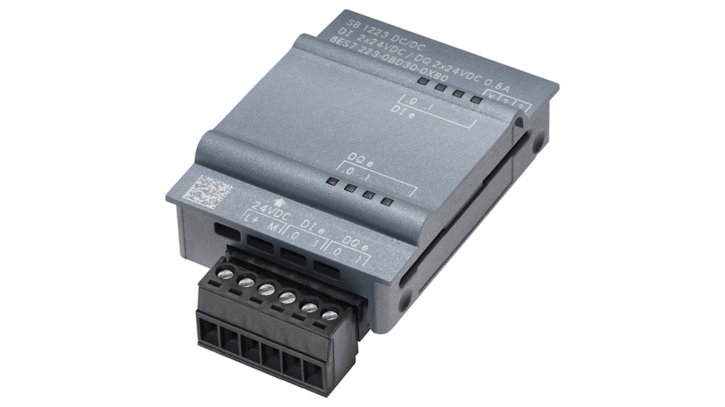 Modulo di espansione PLC Siemens, compatibile con la serie S7-1200, tensione di alimentazione 28,8 V, corrente di uscita 500 mA, ingressi e uscite digitali, 2 ingressi e 2 uscite, dimensioni 62 x 38 x 21 mm, temperatura operativa massima +60°C, protezione da cortocircuiti, bassa perdita di potenza 1W, progettato per integrazione nei sistemi di automazione industriale.
