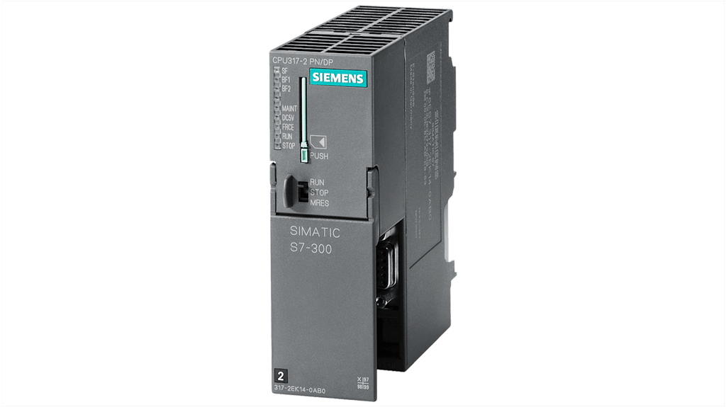 CPU PLC Siemens per automazione industriale, tensione di alimentazione 24 V c.c., velocità di trasmissione 12 Mbit/s, compatibile con SIMATIC S7-300, interfaccia RS 485, supporta protocolli PROFIBUS, PROFINET e MPI, dimensioni 125 x 40 x 130 mm, peso 340 g, temperatura operativa da 0 a 60 gradi Celsius, memoria 1024 byte, corrente di uscita 200 mA, due porte di comunicazione RJ45.