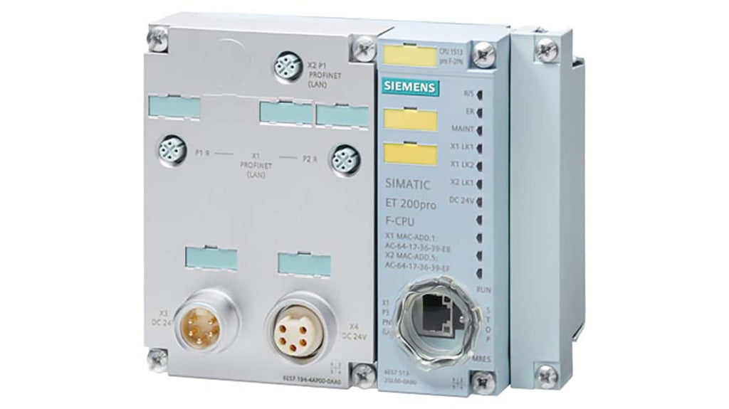 Unità di elaborazione centrale CPU PLC Siemens SIMATIC DP, 20 ingressi, 20 uscite, memoria di lavoro 450KB, memoria dati 1,5MB, alimentazione bus backplane 2,275W, compatibile con ET 200Pro, rete Ethernet, interfaccia di programmazione con connettore RJ45. Codice costruttore 6ES7513-2GL00-0AB0.