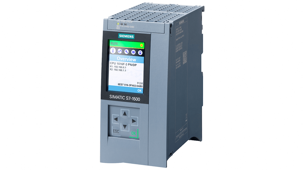 CPU PLC Siemens, serie SIMATIC S7-1500F, 20 ingressi e 20 uscite, tensione di alimentazione 24 V c.c., consumo corrente 0,85 A, risoluzione problemi fino a 10 ns, temperatura operativa da -25 a +60 gradi, interfacce di programmazione Profibus e Profinet, dimensioni 147 x 129 x 70 mm, memoria di lavoro 3 MB, memoria dati 7,5 MB, slot per scheda di memoria SIMATIC fino a 32 GB. Codice costruttore 6ES7516-3FP03-0AB0.