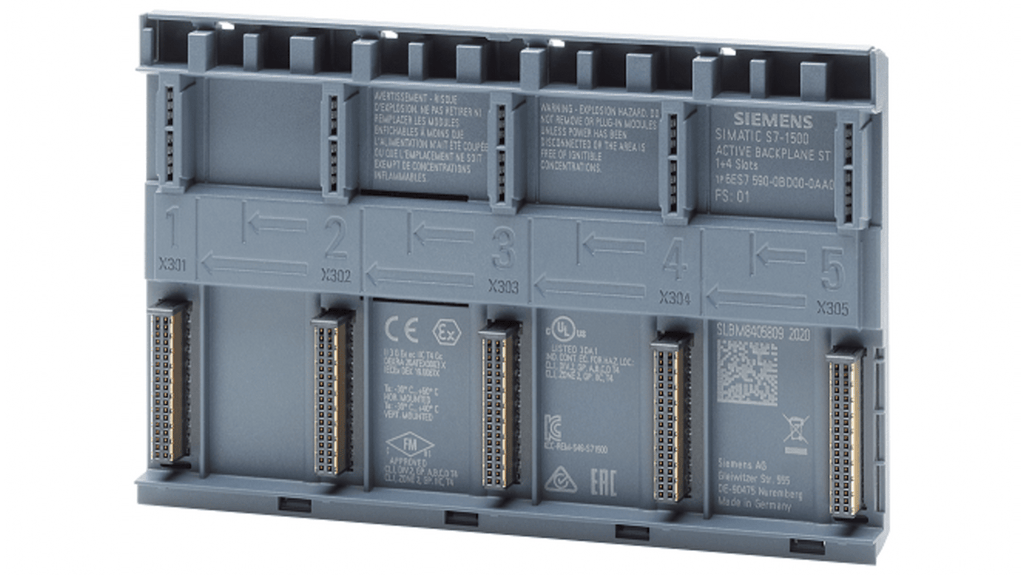 Backplane attivo per guida DIN, Siemens SIMATIC S7-1500 / ET 200, dotato di 4 slot per moduli I/O S7-1500, supporto per sostituzione a caldo, compatibile con IM 155-5 PN HF (da FW V4.4.1), aggiornamento firmware possibile, dimensioni 154 x 99 x 14 mm.