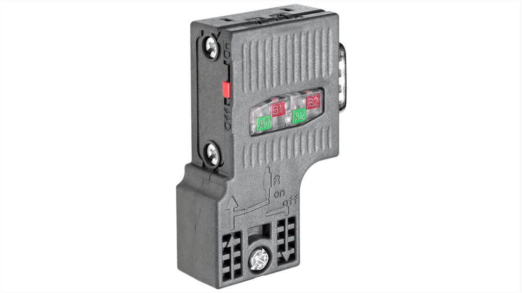 Connettore maschio di collegamento per SIMATIC DP PROFIBUS, utilizzato per velocità fino a 12 Mbps, uscita del cavo a 90 gradi. Dimensioni 15,8 x 59 x 35,6 mm, dotato di metodo di spostamento dell'isolamento Fast Connect. Prodotto da Siemens, codice costruttore 6ES79720BA520XB0. Senza connettore femmina PG.