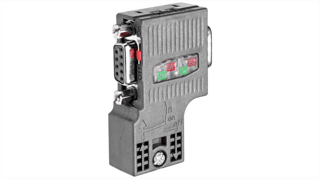 Zoccolo relè per SIMATIC DP PROFIBUS. Connettore maschio per PROFIBUS fino a 12 Mbps, uscita cavo a 90°, metodo di spostamento dell'isolamento Fast Connect. Contenitore in plastica, dimensioni 15,8 x 59 x 35,6 mm. Compatibile con la serie SIMATIC.