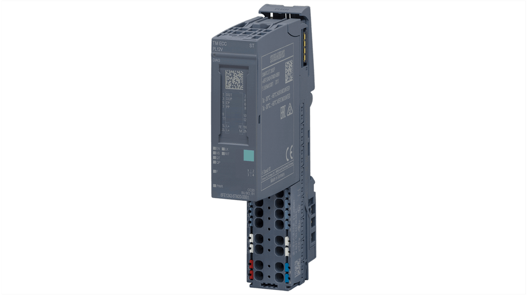 Controller di carica Siemens per veicoli elettrici, conforme a DIN SPEC 70121, modello 6FE12426TM200BB1, dotato di 1 pilota di controllo Powerline Green Phy, 1 connettore maschio di presenza/pilota di prossimità, 1 uscita digitale TRIP-Funzione, 1 uscita digitale DQ P, grado di protezione IP20, dimensioni 73 x 20 x 58 mm, per utilizzo con ET 200SP.