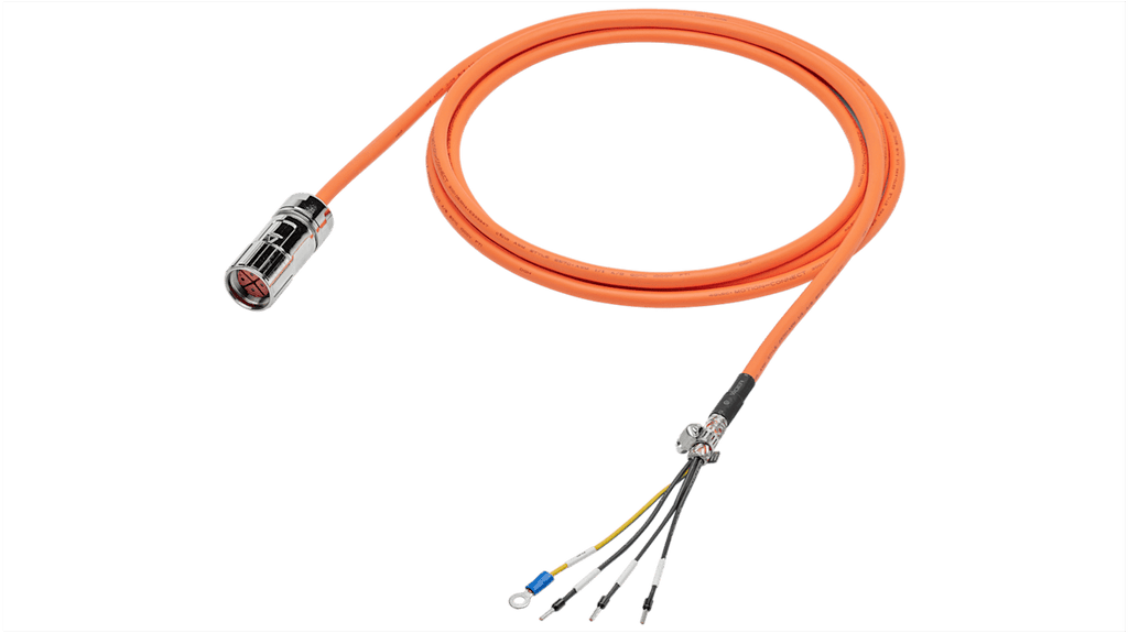 Cavo di alimentazione a 4 conduttori per SINAMICS V90, sezione trasversale 1.5mm², lunghezza 20m, tensione nominale 600V, grado di protezione IP65, temperatura d'esercizio -25 °C a 80 °C, guaina e isolamento in PVC, raggio di curvatura minimo 155mm, connettore diritto. Codice costruttore 6FX3002-5CL02-1CA0, marchio Siemens.