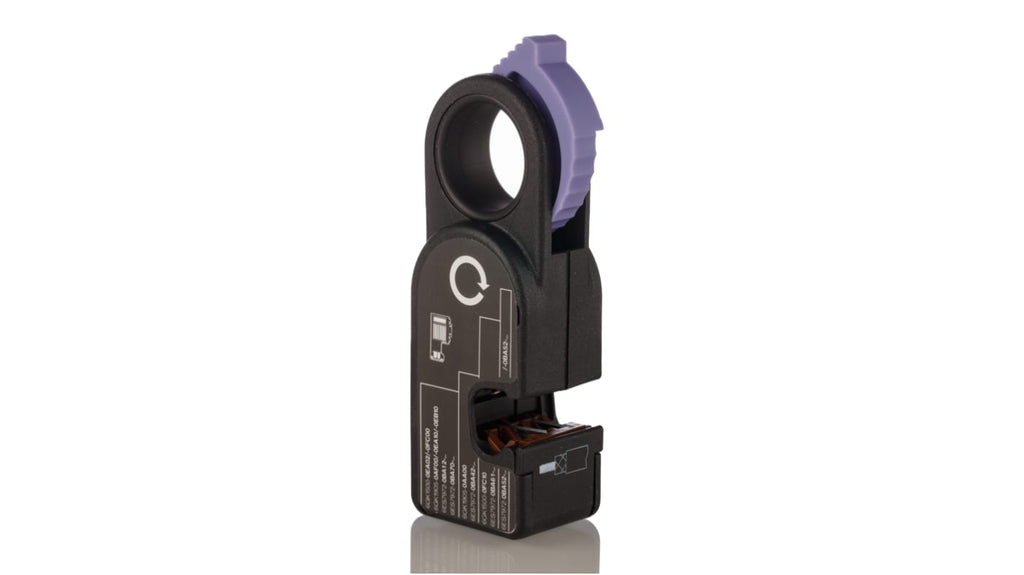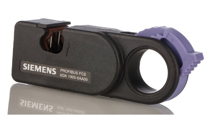 Spelacavi manuale per cavo bus PROFIBUS FastConnect, codice 6GK1905-6AA00, marchio Siemens. Design ergonomico ad anello, corpo in materiale termoplastico resistente agli urti, cassetto lame integrato con due lame per tagli precisi. Durata della cassetta per lame fino a 1500 tagli. Non adatto per il taglio dei fili. Specifico per uso con cavo bus PROFIBUS FastConnect.