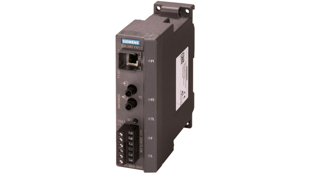Modulo di connessione LAN Siemens, serie 6ES7, codice 6GK5101-1BC00-2AA3, media converter industriale non gestito, supporta reti Ethernet 10/100 Mbit/s, portata fino a 26000 m, interfaccia multimodalitĂ , alimentazione ridondante, diagnostica a LED, grado di protezione IP30, intervallo di temperatura operativa da -10 a +60 gradi Celsius, dimensioni 125 x 40 x 124 mm.