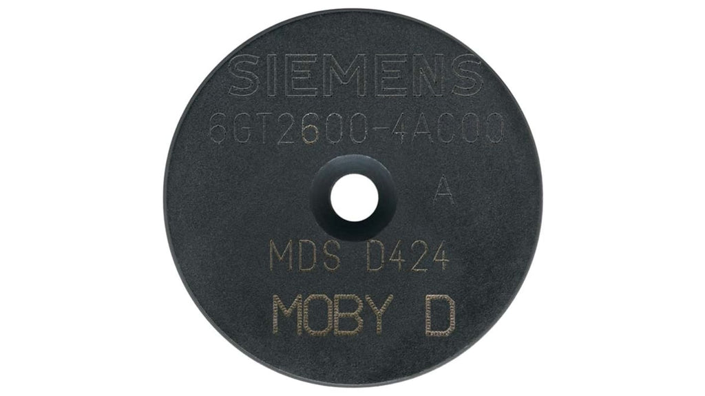 Transponder RFID Siemens per RF200/RF300, trasmissione radio ISO 15693, capacità di memorizzazione 2000 byte, tipo di memoria FRAM, velocità di trasferimento 26,5 kbit/s, grado di protezione IP67, dimensioni 27 x 4 mm, montaggio con colla, vite M3, connessione wireless.