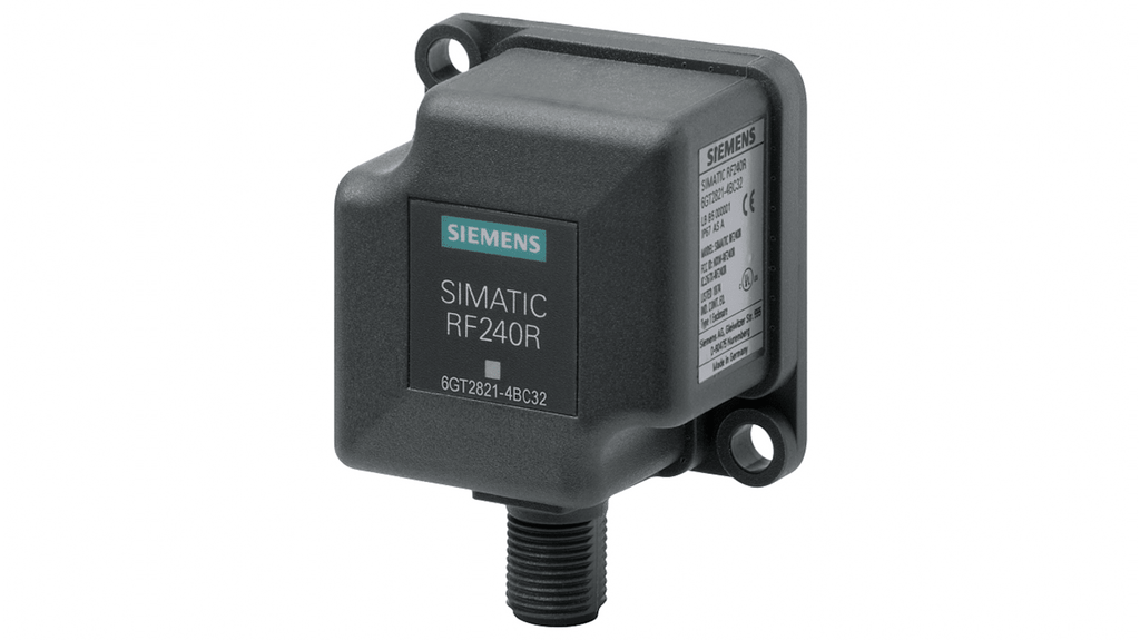Lettore RFID Siemens, modello SIMATIC RF200 RF240R, interfaccia RS422, gamma di rilevamento 65 mm, temperatura operativa da -25 a +70 gradi, grado di protezione IP67, dimensioni 50 x 50 x 30 mm, antenna integrata. Codice costruttore 6GT28214AC10.