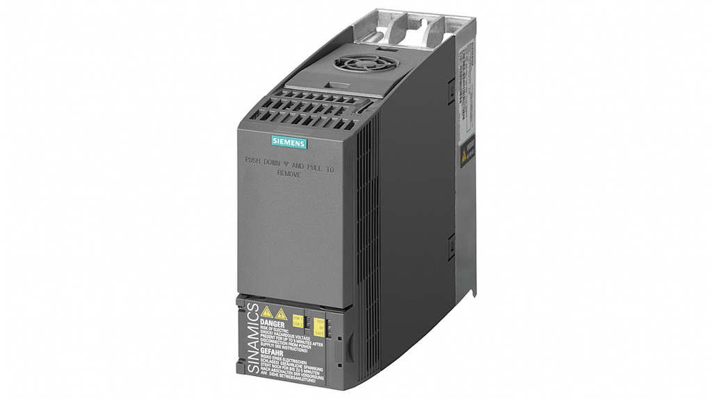 Inverter Siemens, 3 kW, 3 fasi, 380-480 V CA, 0-550 Hz. Codice costruttore 6SL3210-1KE17-5AP1. Potenza nominale 3 kW, corrente nominale 7,3 A, grado di protezione IP20. Filtro integrato classe A, interfaccia PROFIBUS-DP, funzionalità di disattivazione della coppia sicura. Dimensioni 196 mm x 73 mm x 203 mm, montaggio a pannello, standard CE, c-tick, cULus. Funzionamento fino a 60 gradi.