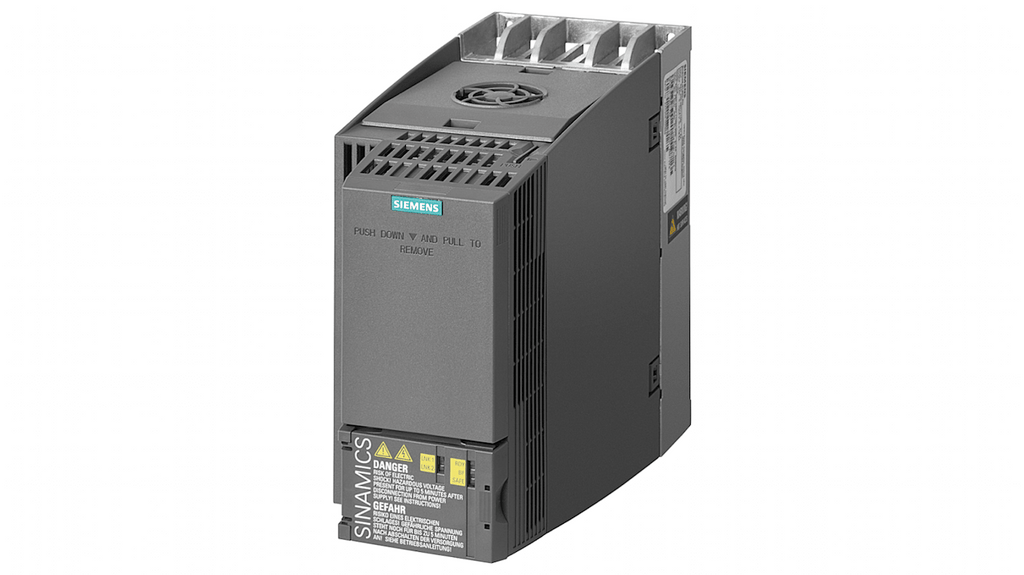 Inverter Siemens, 7,5 kW, 3 fasi, 380-480 V CA, 0-550 Hz. Modello 6SL3210-1KE21-7AP1, design compatto, dimensioni 196 mm x 100 mm x 203 mm, grado di protezione IP20. Capacità di sovraccarico 150% per 3 secondi, filtro integrato classe A, interfaccia I/O con 6 ingressi digitali, 2 uscite digitali, 1 ingresso analogico, 1 uscita analogica. Funzionalità di sicurezza Safe Torque Off, supporto PROFINET-PN. Normative CE, c-tick, cULus.