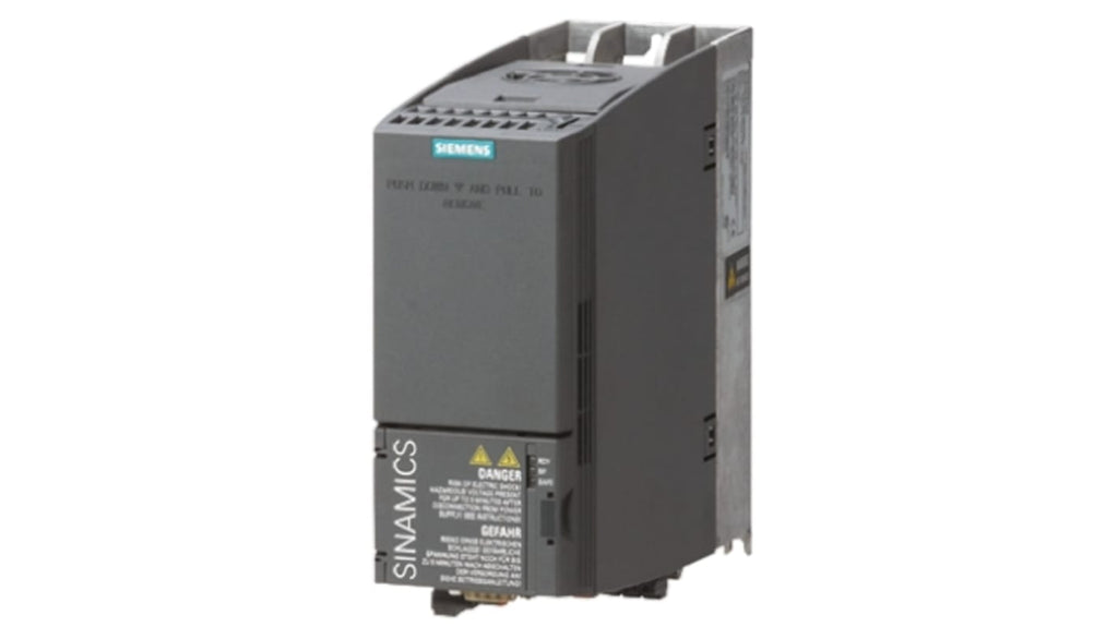 Inverter Siemens, 7,5 kW, 400 V c.a., 3 fasi, 0 a 550Hz. Modello SINAMICS G120C, potenza nominale 7,5 kW, corrente nominale 16,5 A, grado di protezione IP20. Dimensioni: 195 mm x 100 mm x 200 mm. Funzione di sicurezza STO, comunicazione Modbus, installazione semplice, messa in servizio intuitiva, controllo vettoriale senza sensore, temperatura operativa fino a 60 gradi. Morsetti a innesto, interfacce di comunicazione integrate.