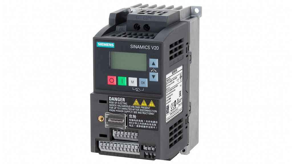 Inverter Siemens per motori c.a., potenza nominale 0,55 kW, tensione 230 V c.a., ingresso monofase, frequenza di uscita 0 a 550 Hz, corrente nominale 3,2 A, grado di protezione IP20, comunicazione USS e Modbus RTU, montaggio fianco a fianco o a parete, dimensioni 127,8 mm x 68 mm x 142 mm, conforme a CE, cULus, EN 60204-1, EN 61800-3, EN 61800-5-1.