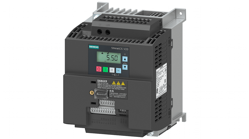 Convertitore Siemens SINAMICS V20, potenza nominale 3 kW, tensione di alimentazione 240 V, fase 1 e 3, corrente nominale 13,6 A, frequenza di uscita 550 Hz, grado di protezione IP20, certificazione CE. Dimensioni: altezza 176,5 mm, larghezza 136 mm, profondità 160 mm. Tipo di comunicazione field bus USS. Codice costruttore 6SL3210-5BB23-0BV1.