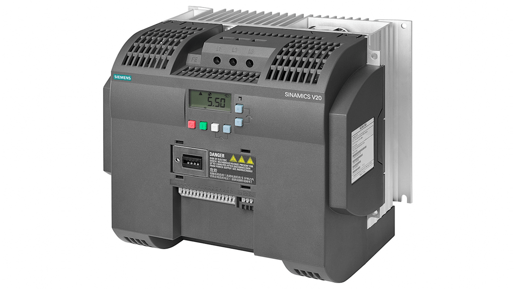 Inverter Siemens, potenza nominale 15 kW, tensione 400 V c.a., 3 fasi, frequenza di uscita 0 a 550 Hz, efficienza 98%, interfaccia di comunicazione USS e Modbus RTU, grado di protezione IP20, dimensioni 207 mm x 240 mm x 173 mm, montaggio a spinta, laterale o a parete, compatibile con motori in c.a., serie SINAMICS V20.