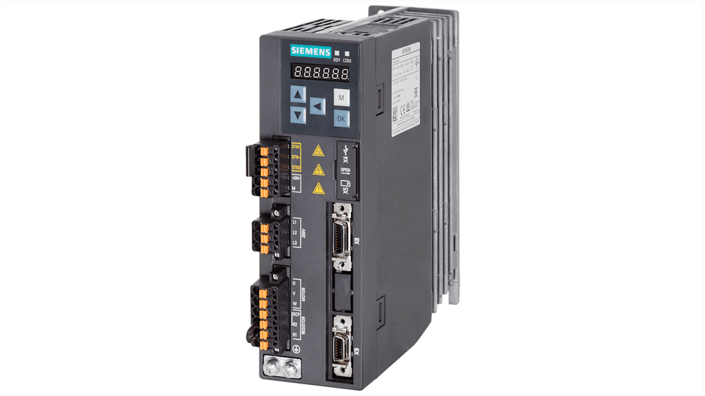 Servoazionamento Siemens, monofase, potenza nominale 0,4 kW, tensione di alimentazione 200-240 V, corrente nominale 7,8 A, 2 uscite digitali, grado di protezione IP20, dimensioni 55 x 170 x 170 mm, temperatura operativa da 0 a 45 gradi Celsius, raffreddamento a convezione, codice costruttore 6SL3210-5FB10-4UF1.