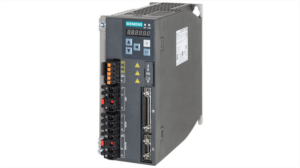 Inverter Siemens, potenza nominale 1,5 kW, tensione di alimentazione 240 V c.a., 3 fasi, corrente nominale 10,6 A, frequenza di uscita 66 Hz, grado di protezione IP20, convezione naturale, compatibile con SINAMICS V90, dotato di funzione STO. Codice costruttore 6SL3210-5FB11-5UA0.