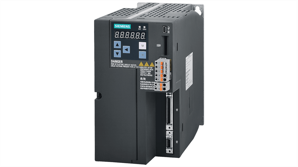 Inverter trifase Siemens, potenza nominale 2,5 kW, tensione di alimentazione 480 V c.a., corrente nominale 7,8 A, frequenza di uscita 66 Hz, raffreddamento a ventola, grado di protezione IP20, serie 6SL3210, compatibile con SINAMICS V90, dotato di funzione STO.