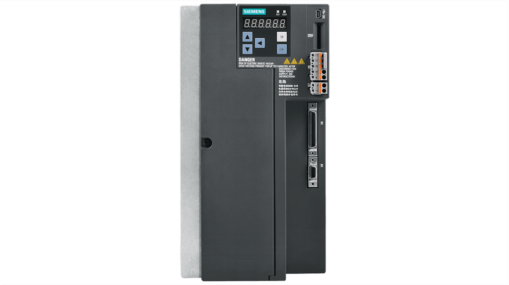 Servocomando Siemens per applicazioni industriali, potenza nominale 3,5 kW, tensione di alimentazione 380-480 V, corrente nominale 33 A, grado di protezione IP20, UL tipo aperto, raffreddamento esterno con ventola, prodotto attivo, codice costruttore 6SL3210-5FE13-5UA0.