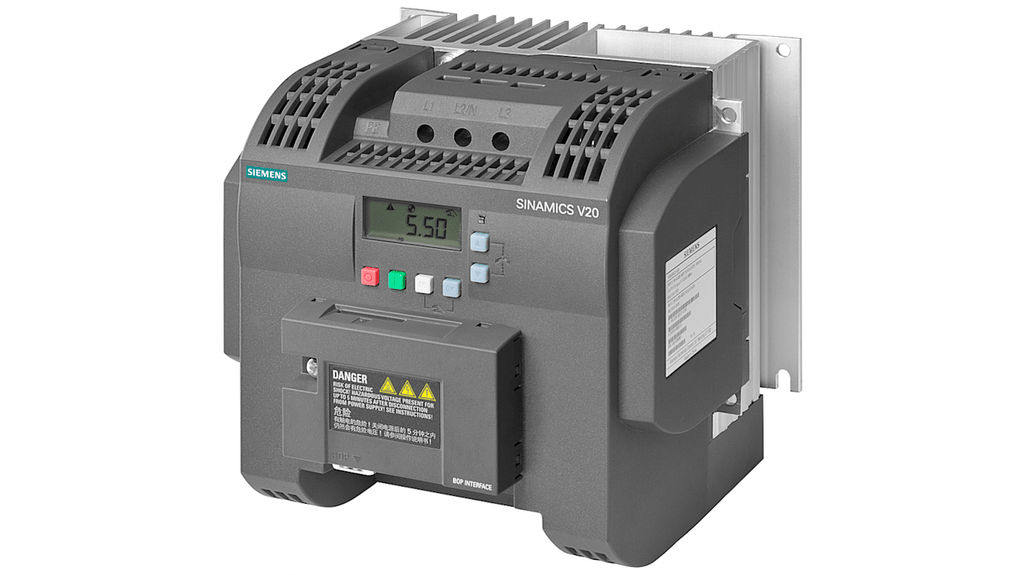 Convertitore Siemens SINAMICS V20, potenza nominale 0,75 kW, tensione di alimentazione 400 V, 3 fasi, corrente nominale 2,2 A, frequenza di uscita 550 Hz, grado di protezione IP20, dimensioni 176,5 mm x 136 mm x 160 mm, certificazione CE, tipo di comunicazione field bus USS. Codice costruttore 6SL3216-5BE17-5CV0.