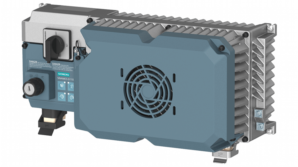 Convertitore Siemens per azionamenti distribuiti, potenza nominale 7,5 kW, tensione di alimentazione 380 a 480 V, 3 fasi, corrente nominale 17,1 A, frequenza di uscita 550 Hz, serie SINAMICS G115D. Supporta motori asincroni IE3 e motori sincroni IE4, installazione diretta sulla macchina, senza armadietto di controllo, sicurezza integrata con funzione sto, design modulare per cablaggio e messa in servizio rapidi.