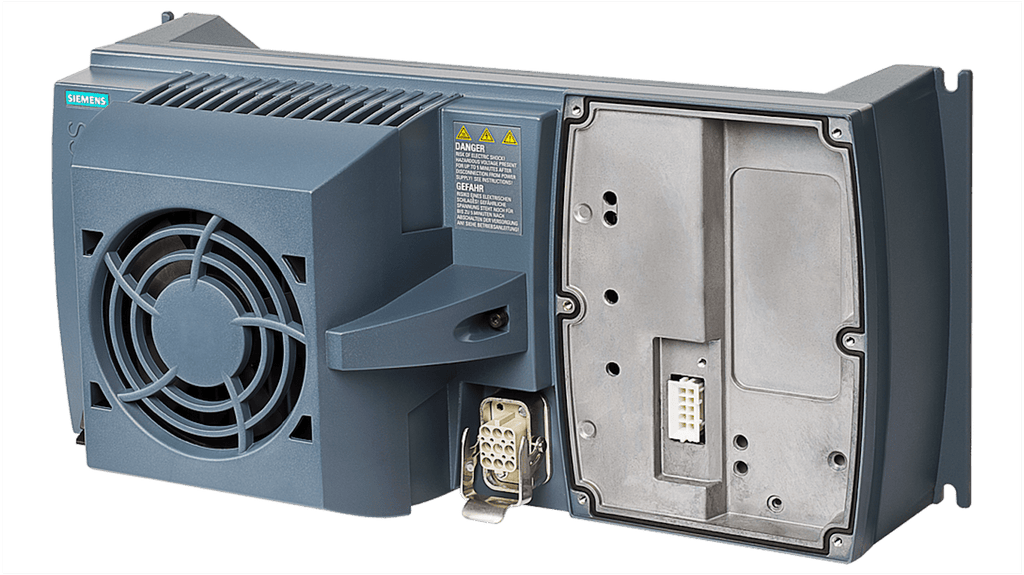 Inverter trifase Siemens, potenza nominale 5,5 kW, tensione di alimentazione 400 V, corrente nominale 12,2 A, grado di protezione IP65, temperatura ambiente -10 a +55 gradi Celsius, modulo di alimentazione PM230 con filtro di classe A integrato, progettato per il recupero energetico, compatibile con la serie 6SL3525.