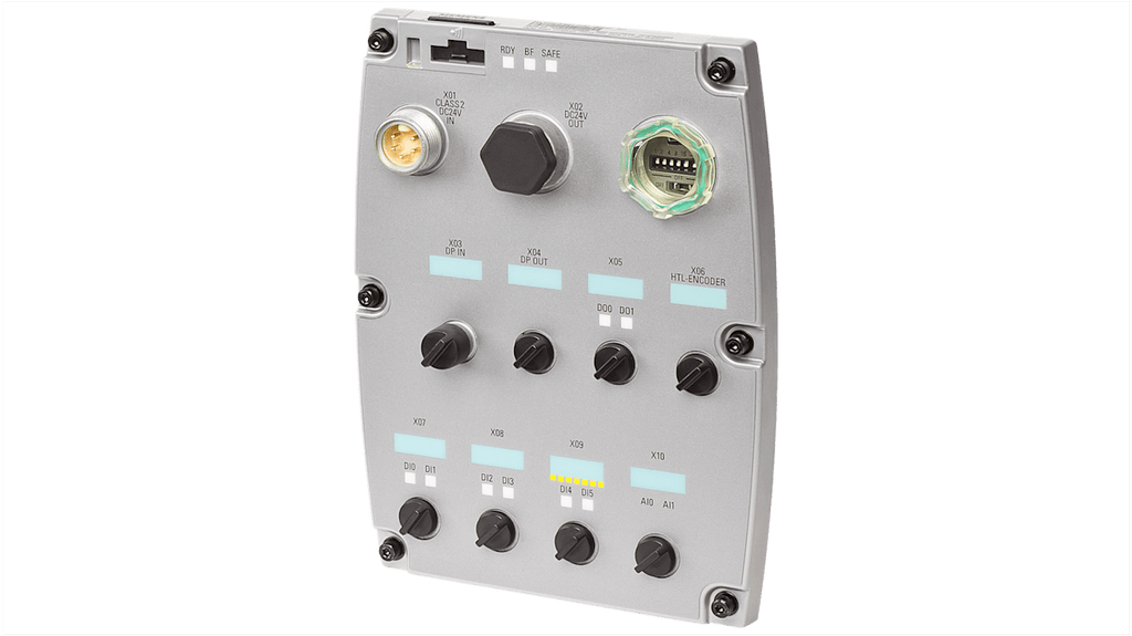 Inverter Siemens, 24 V c.c., codice 6SL3544-0FB20-1PA0, dotato di funzionalità PROFIBUS DP e STO, 6 ingressi digitali, 1 ingresso digitale di sicurezza, 2 uscite digitali, 2 ingressi analogici, conforme a RoHS, grado di protezione IP65.