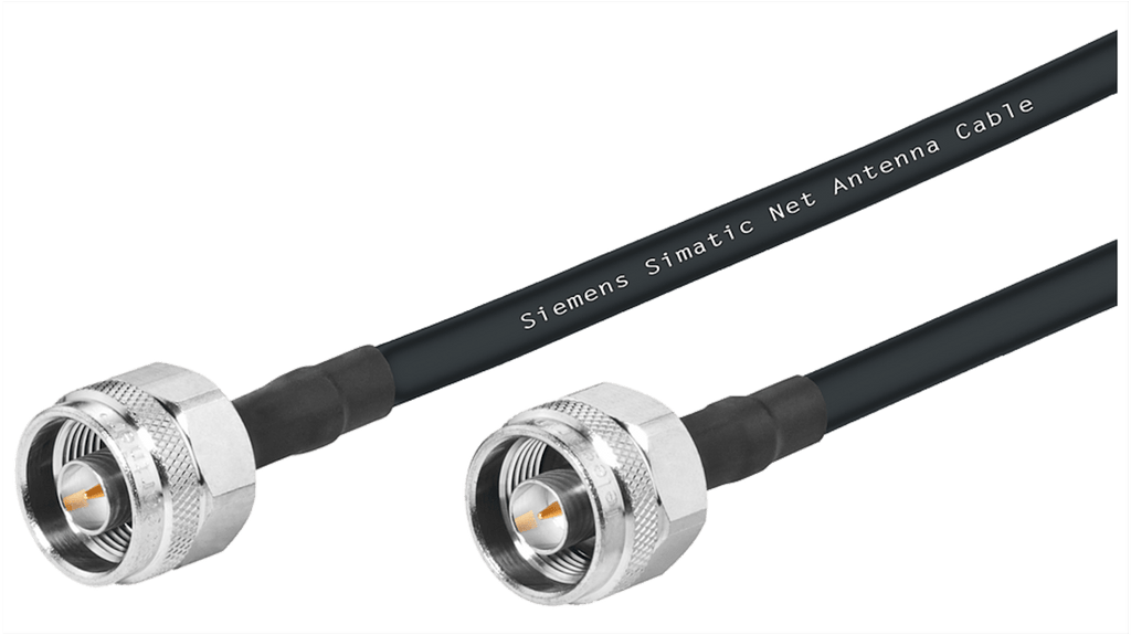 Cavo coassiale per collegamento antenna, tipo N maschio/maschio, lunghezza 1 m, impedenza 50 Ω, schermatura intrecciata in rame stagnato, adatto per IWLAN e applicazioni ferroviarie, diametro esterno 5.5 mm, colore nero, con terminazione. Marchio Siemens, codice costruttore 6XV18755SH10.